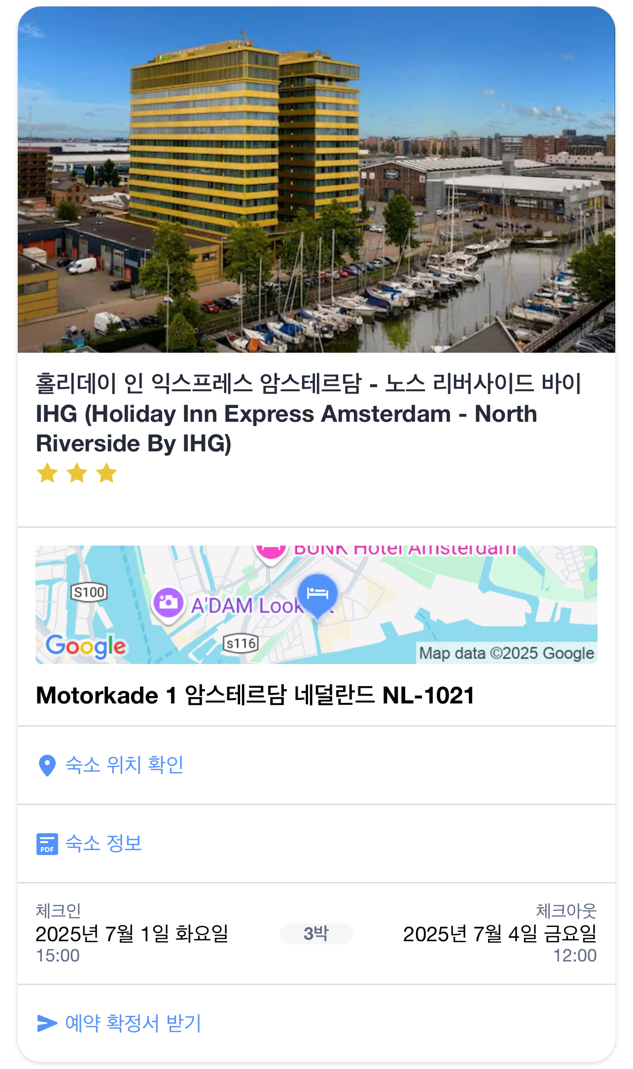 3박 숙박 금액은 총 41만원 정도로, 꽤 괜찮은 가격! 시내에 위치한 3성급 호텔들도 40~50만원대 호텔이지만 홀리데이인 노스리버사이드의 장점은 무료 조식이다. 조식이 꽤나 든든하고 특히나 네덜란드가 요거트, 치즈와 같은 유제품이 발달한 곳이라는 점에서 부족함 없는 메뉴들이 만족스러웠어서 좋았다!