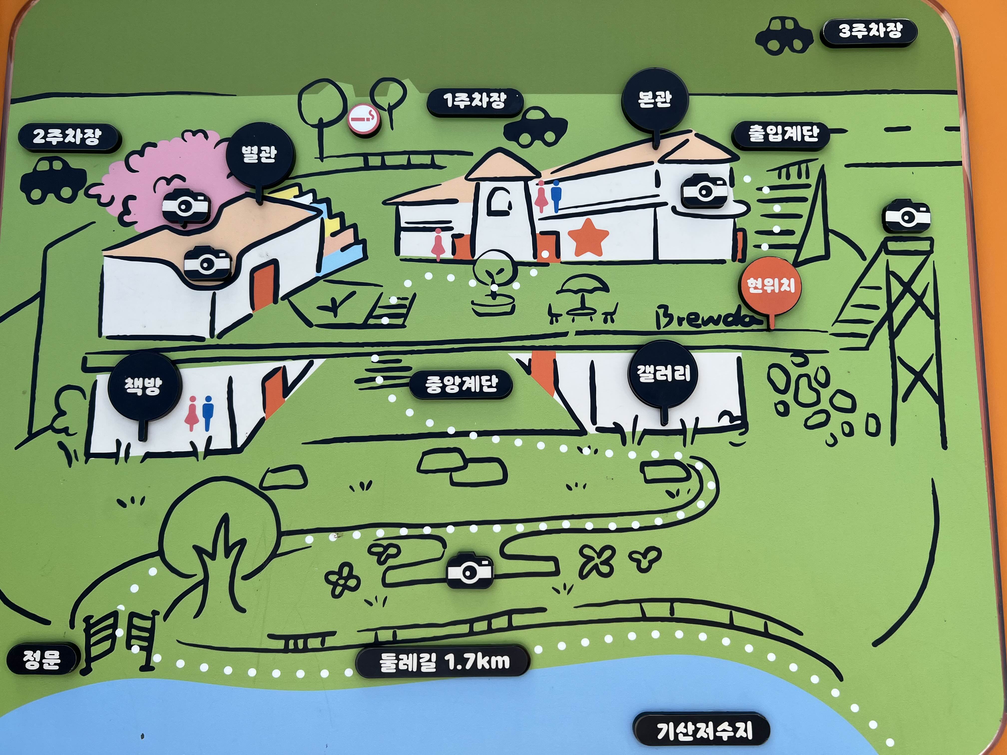 얼마나 넓으면 이렇게 지도도 나와있다. 우리는 본관에서 주로 커피를 마셨는데 별관은 반려견을 동반한 분들이 이용할 수 있고 갤러리, 책방(북카페) 등의 공간으로 나누어져 있다. 아래쪽은 정원과 둘레길로 되어 있어 기산저수지 근처를 산책할 수 있다.