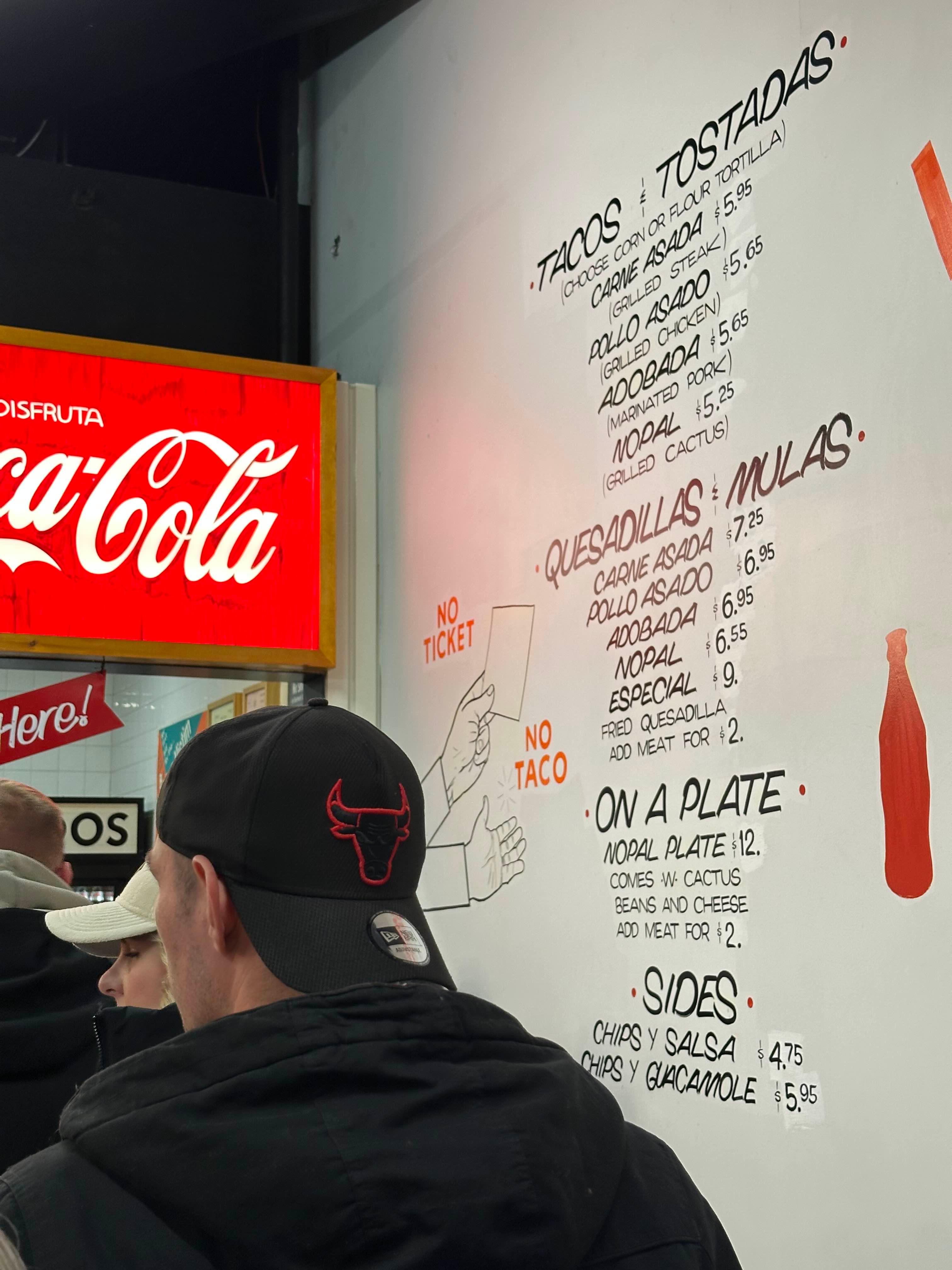 줄을 따라가며 벽에 적힌 메뉴를 보고 마음을 정해야 하는데 시끄럽고 정신도 없고 불의 열기까지 느껴져 주문할 때 버벅이게 될 것이다. 가기 전 알고 가면 좋을 내용을 공유해보자면 타코와 퀘사디아는 둘다 토르티야(Tortilla)에 먹지만 타코는 오픈형, 퀘사디아는 재료를 안에 넣고 반으로 접어 굽는다고 생각하면 된다. 참고로 이 곳의 별미는 NOPAL인데 바로.. 🌵 선인장이고, 스페인어를 안다면 주문하기 쉬우니 가기 전에 공부하고 간다면 두배로 재밌는 경험이 될 것이다! (직원 모두 중남미계)
