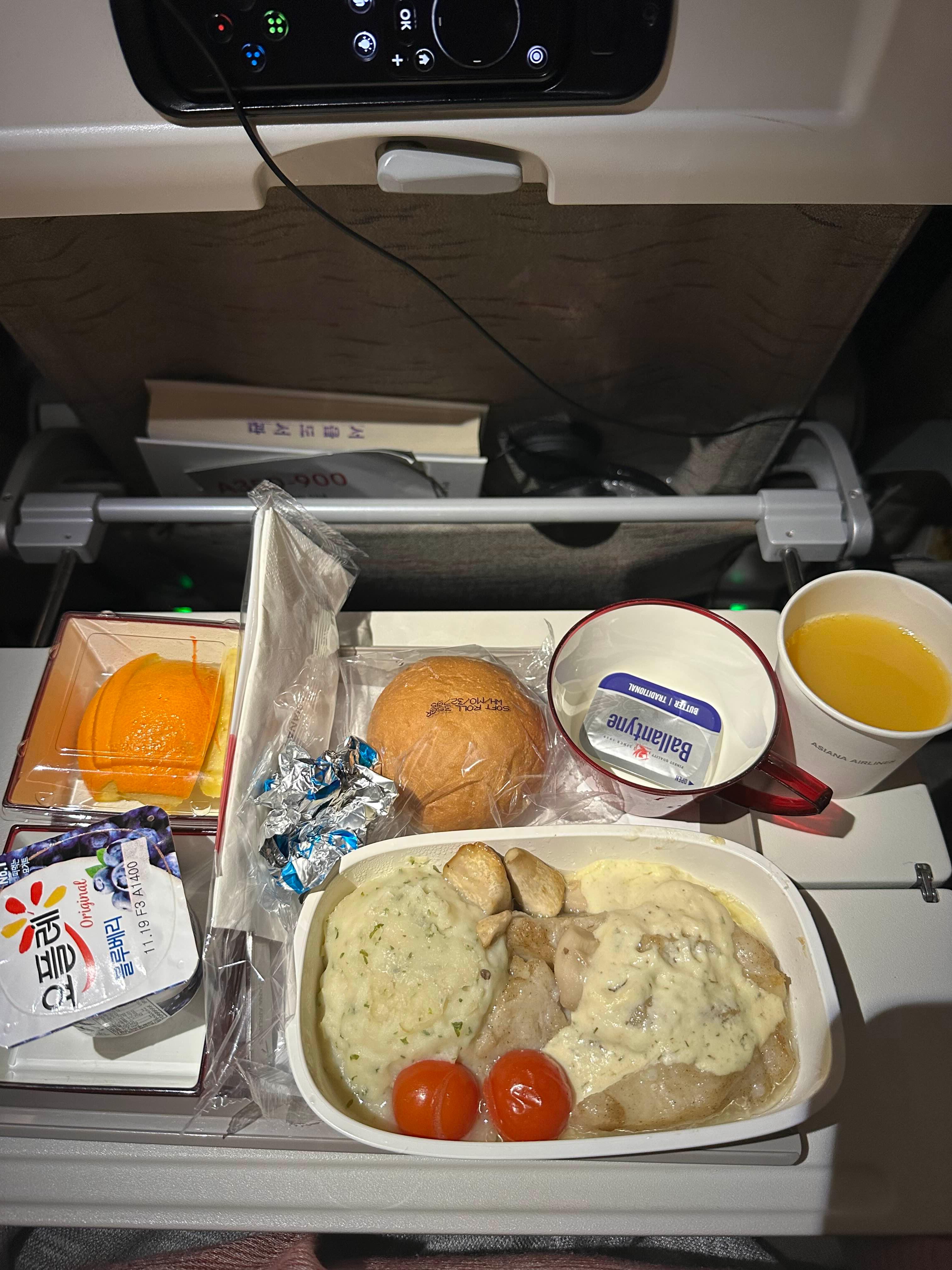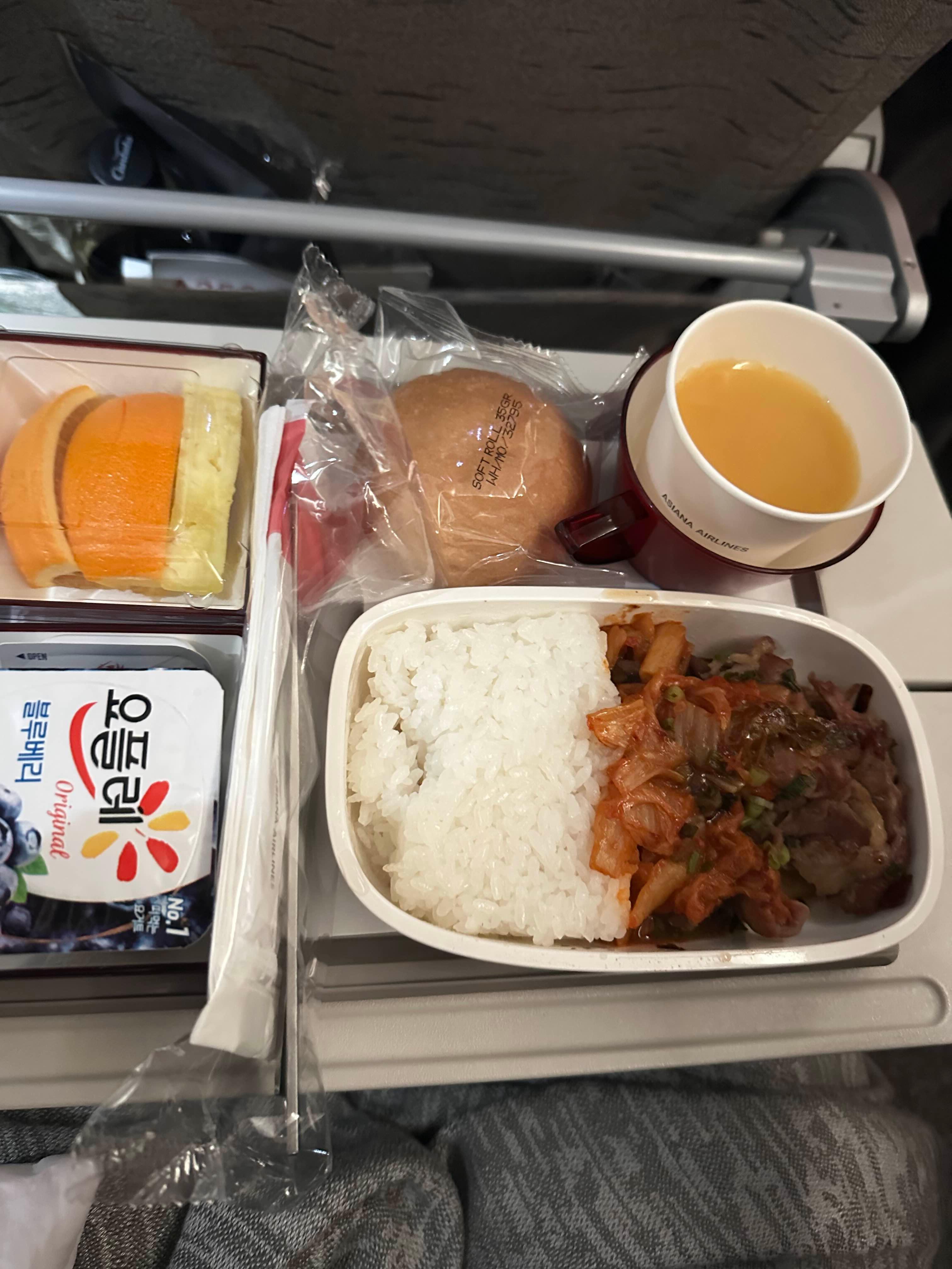 마지막 기내식은 생선요리와 볶음김치(?) 요리가 나오는데 마지막 기내식도 한식이 더 맛있었다. 생선은 좀 느끼한편 ㅠㅠ 아시아나는 이왕이면 한식 선택하는게 좋은 것 같아요.
